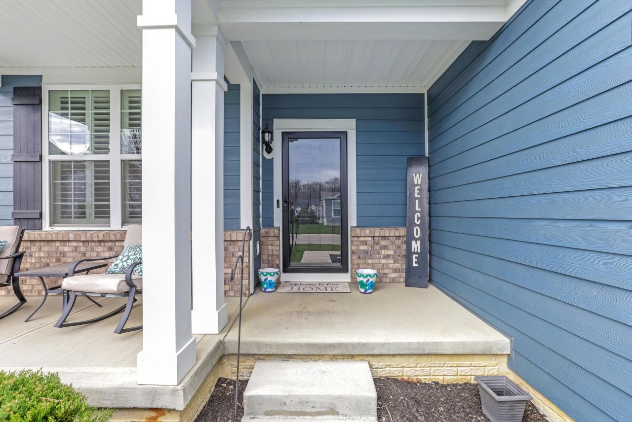Single-family living with true condo-style convenience with 3,466 sqft! This better-than-new ranch blends thoughtful design, modern finishes and low-maintenance living in one impressive package. A welcoming covered front porch and entry lead to a private office with French doors and plantation blinds--perfect for working from home or a quiet retreat. The open-concept kitchen is the heart of the home, featuring stainless steel appliances including a gas cooktop with electric oven, convection microwave, oversized island with seating for four, granite countertops, white tile backsplash, bronze fixtures, stainless sinks and abundant cabinet and pantry storage. Just off the kitchen, a built-in beverage station offers a second sink, wine rack, beverage refrigerator and additional cabinetry--ideal for entertaining. The dinette flows seamlessly into the spacious great room, highlighted by a cozy corner gas log fireplace with switch. The first-floor primary suite impresses with high ceiling, remote-controlled blackout blinds and a luxurious en-suite bath complete with double vanity, walk-in shower, private water closet and generous walk-in closet. Adjacent Laundry includes a utility sink and overhead cabinetry with storage/drying rack. The main level also offers a second bedroom, full bath and a well-designed mudroom with built-ins and separate closet just off the attached two-car garage. The full finished basement with egress window provides flexible living space, two storage areas and a full bath rough-in with potential for a third bedroom and full bath--ideal for guests or a mother-in-law suite. Outdoor living shines with a large concrete patio, covered pergola and built-in fire pit, perfect for relaxing or entertaining. Additional highlights: 2 linen closets, LVT flooring, modern white/gray/black finishes, 2-panel white doors, security system, TV mounts convey, storm doors front and rear, new garage door with keyless entry, 20 solar panels, and annual driveway sealing.